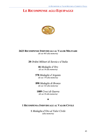I Carristi risultano titolari di 2623 ricompense individuali al Valor Militare, un numero eccezionale se rapportato alla ridotta consistenza organica della Specialità e alla brevità del periodo bellico che ha interessato il Corpo (1935-1945). La ricerca ha inoltre permesso di recuperare episodi poco noti, come le prime due Medaglie d’Argento (1933) conferite in tempo di pace a due Carristi del III Battaglione Carri Armati, e di includere ricompense significative legate alla fase pionieristica della meccanizzazione, tra cui la Croce di Cavaliere dell’Ordine Militare di Savoia al capitano Orlando Lorenzini.
