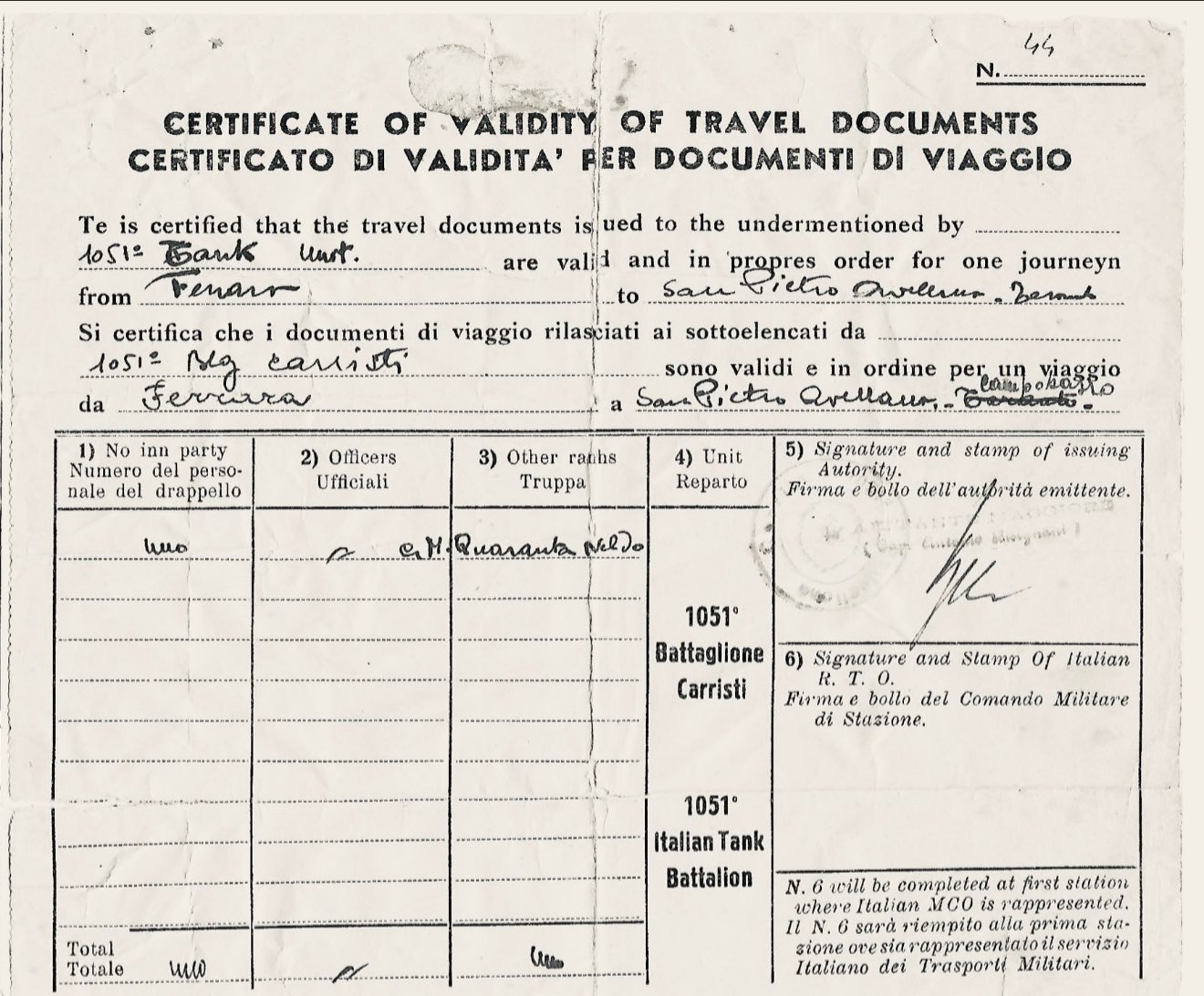 1051° Battaglione Carristi Autieri embedded nell’8^ Armata Britannica. Originato dal LI Battaglione Carri Leggeri – reparto di stanza a Taviano (LE) nel settembre 1943 e sopravvissuto agli eventi dell’8 settembre 1943. Dette origine alla compagnia Carristi Arditi (che fornì personale impiegato per operazioni particolarmente rischiose condotte all’interno del territorio occupato dai tedeschi) e al Centro di Raccolta Carristi organizzato per raccogliere il personale in afflusso dalle zone occupate. Detto Centro forrmò nel 1943-44 il 1051° Battaglione Carristi Autieri – al comando del Maggiore Michele Alterio – (che nell’Ordine di Battaglia della 8^ Armata veniva designato come 1051st Tank Battalion) incorporato nella 228^ Divisione, operante in supporto della Grande Unità Britannica al seguito della quale risalì la dorsale adriatica sino a Basiliano (UD) con il compito di provvedere al recupero e alla riparazione dei mezzi corazzati britannici,. Fu uno degli ultimi reparti ad essere sciolto (fine 1945) dopo la cessazione delle ostilità. Aveva una forza di 12 ufficiali e circa 322 tra SU e Tr. che continuarono a portare sulle proprie uniformi le mostreggiature rosso-blu dei Carristi… La storia di questo particolare reparto è ancora da scrivere.